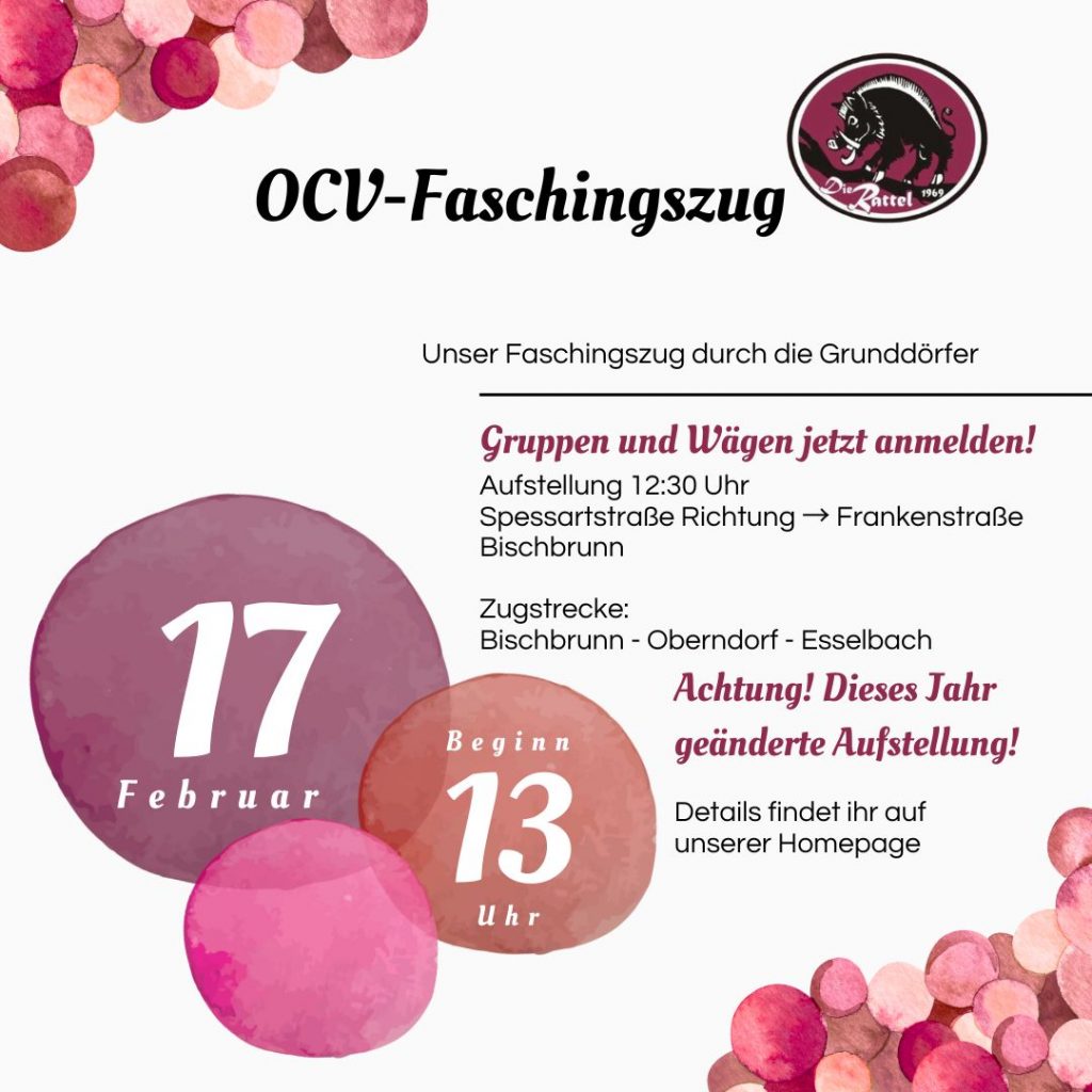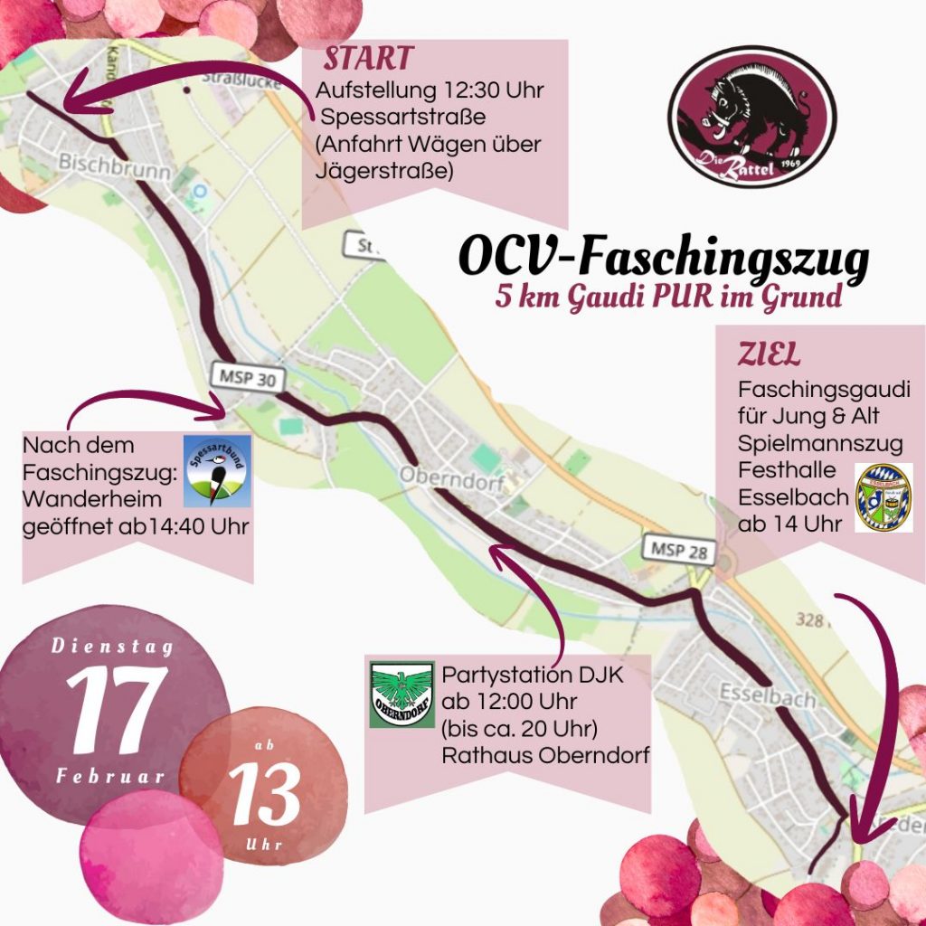 Der OCV – Oberndorfer Carnevalverein „Die Rattel“ lädt alle Narren zum „Faschingszug durch den Spessartgrund“ herzlich ein 🎉🥳