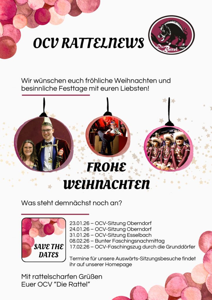 Wir wünschen euch frohe Weihnachten, einen guten Rutsch ins neue Jahr und freuen uns schon jetzt auf die kommende Faschingszeit! 🎭